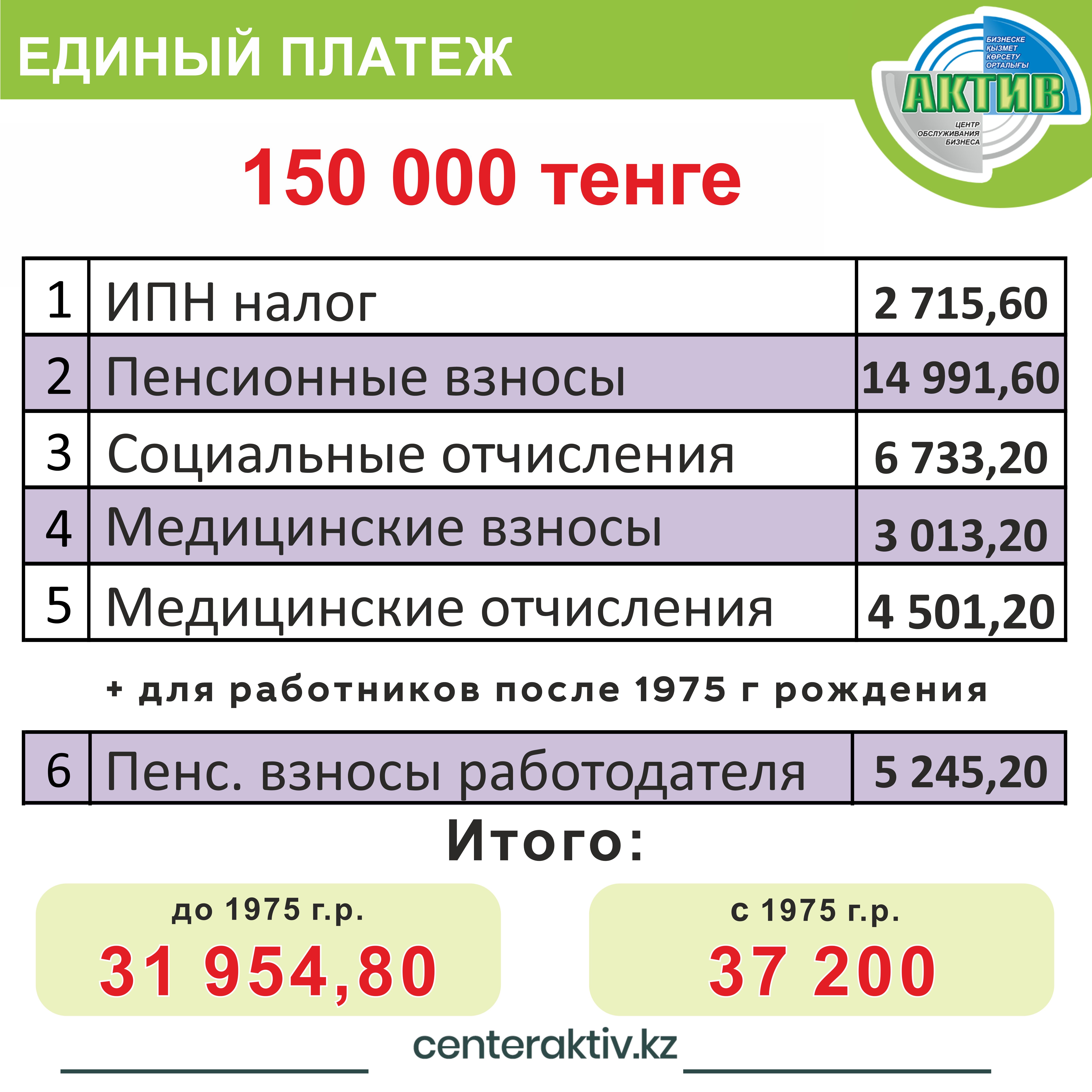Пенсионные взносы работодателя начисляются по ставке 3,4968%. Не уплачиваются за пенсионеров, инвалидов I и II группы (бессрочно), а также за работников, рожденных до 1975 года. Минимальный размер — 2 972,28 тенге, максимальный — 148 614 тенге.